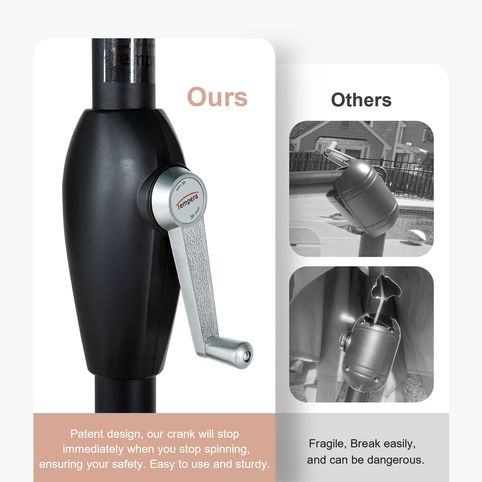 ¡¾Push Button Tilt and Crank¡¿Tempera adopts patented crank to make it easier to open and close the umbrella. Tilt the umbrella with the press of a button and adjust it according to the position of the sun. keeping cool and comfortable from the sun.
