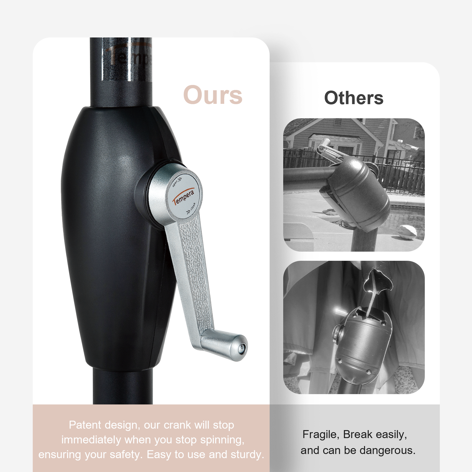 ¡¾Push Button Tilt and Crank¡¿Tempera adopts patented crank to make it easier to open and close the umbrella. Tilt the umbrella with the press of a button and adjust it according to the position of the sun. keeping cool and comfortable from the sun.